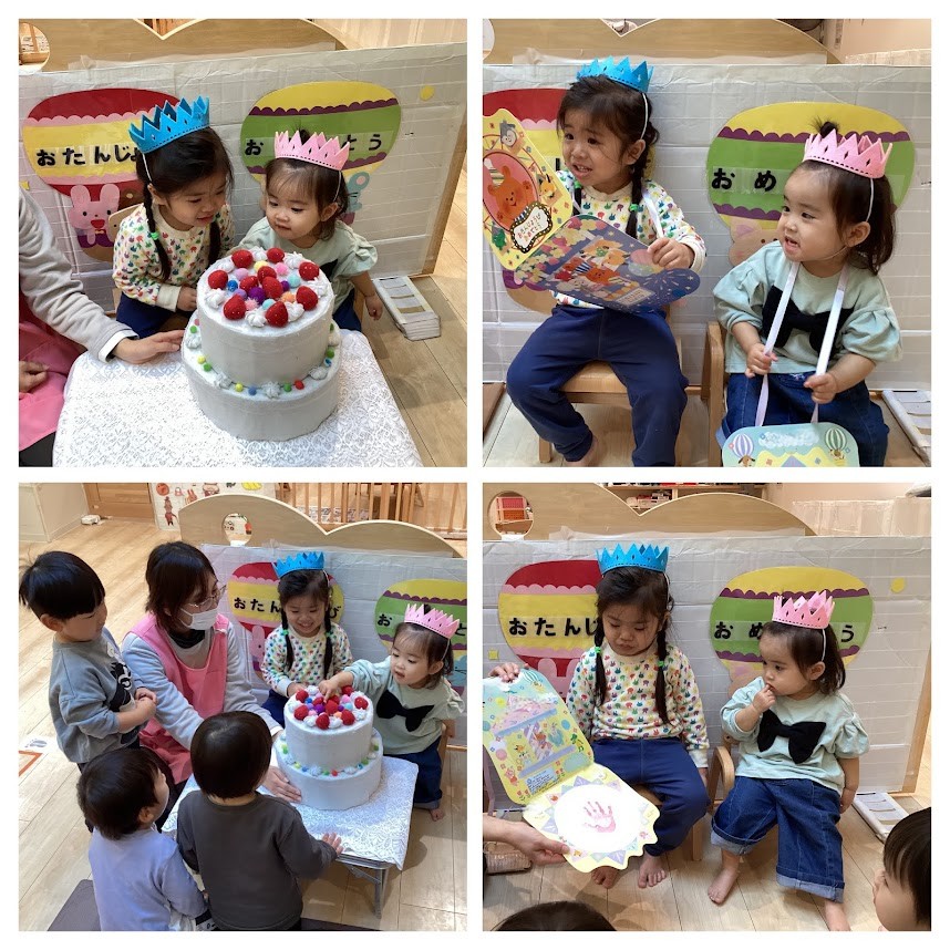 ケーキのロウソクをフゥーと吹き消してお誕生日カードをもらいました。フェルトのケーキは全員で食べるまねっこで仲良くいただきます🎂🎊