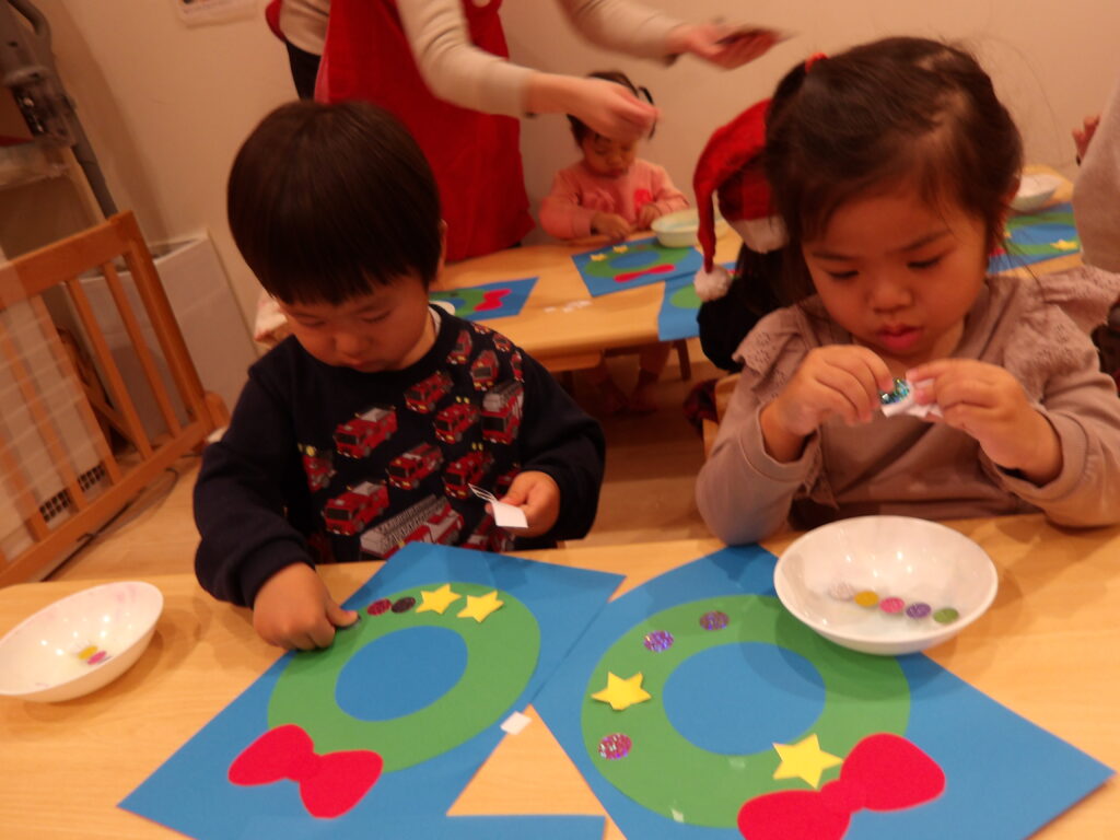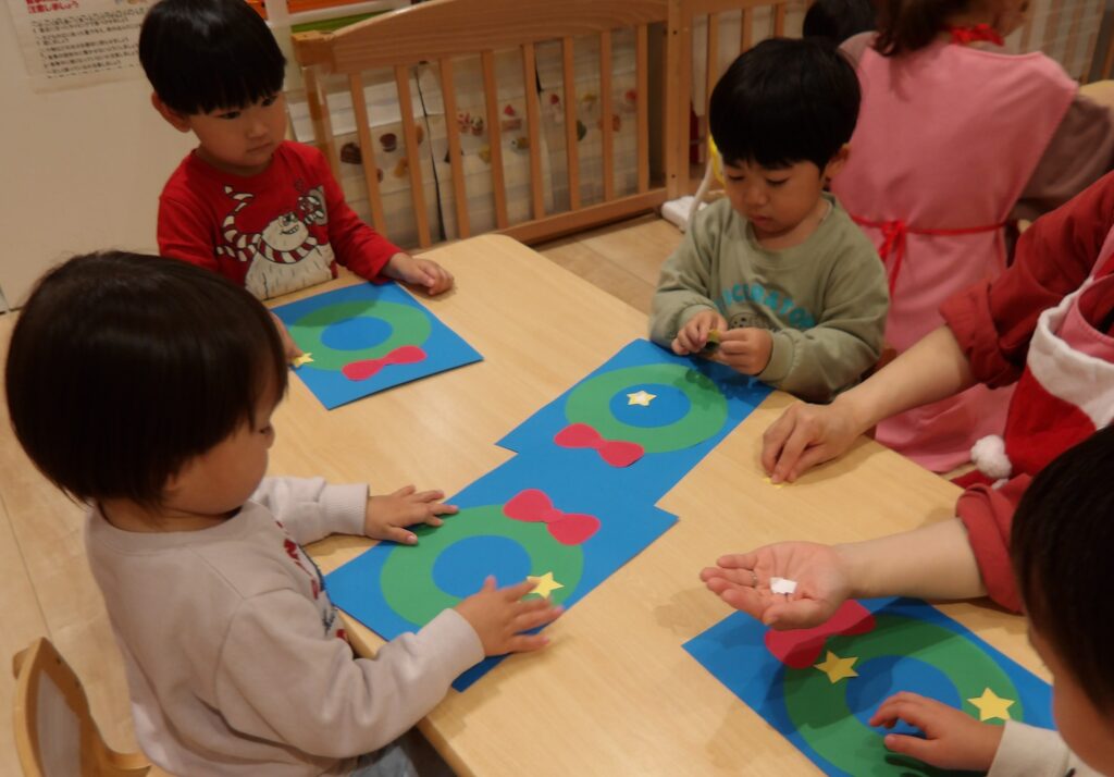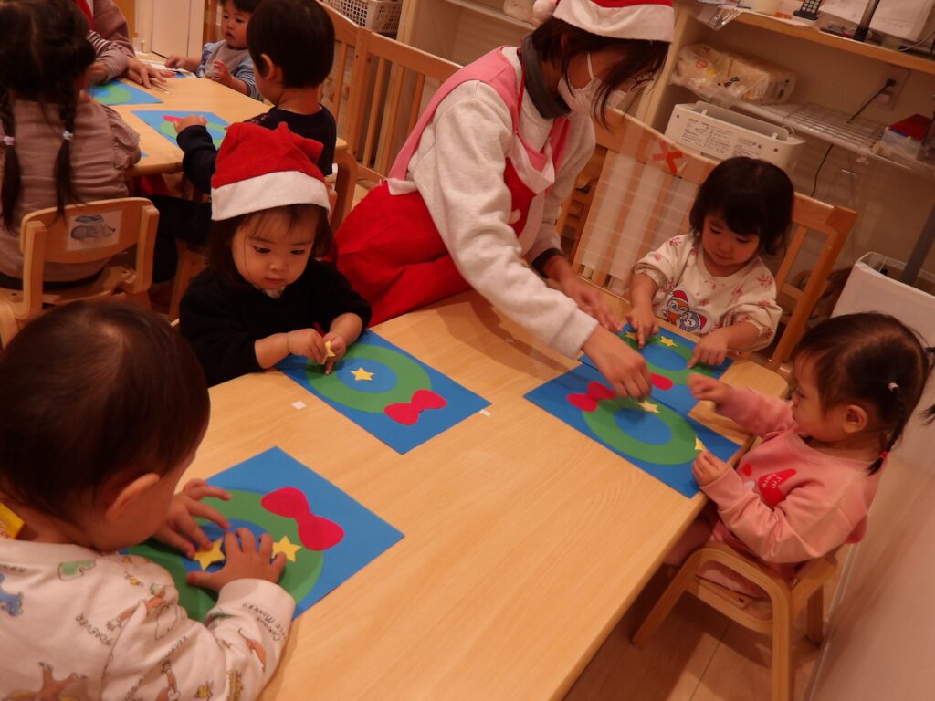 クリスマス会でリースの製作をしました。星やキラキラのシールを貼って飾りつけ。台紙からシールを自分ではがして貼る表情が真剣ですね🎖️指先がどんどん器用になってきて、保育者に手伝ってもらうことなく、1人で貼れるようになってきている子どもたち。自分で貼るのがとても楽しかったようで、「ここにもはる!」とニコニコしながら貼っていました🎉出来上がったリースは壁に飾って鑑賞会をしました♪