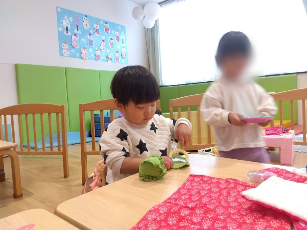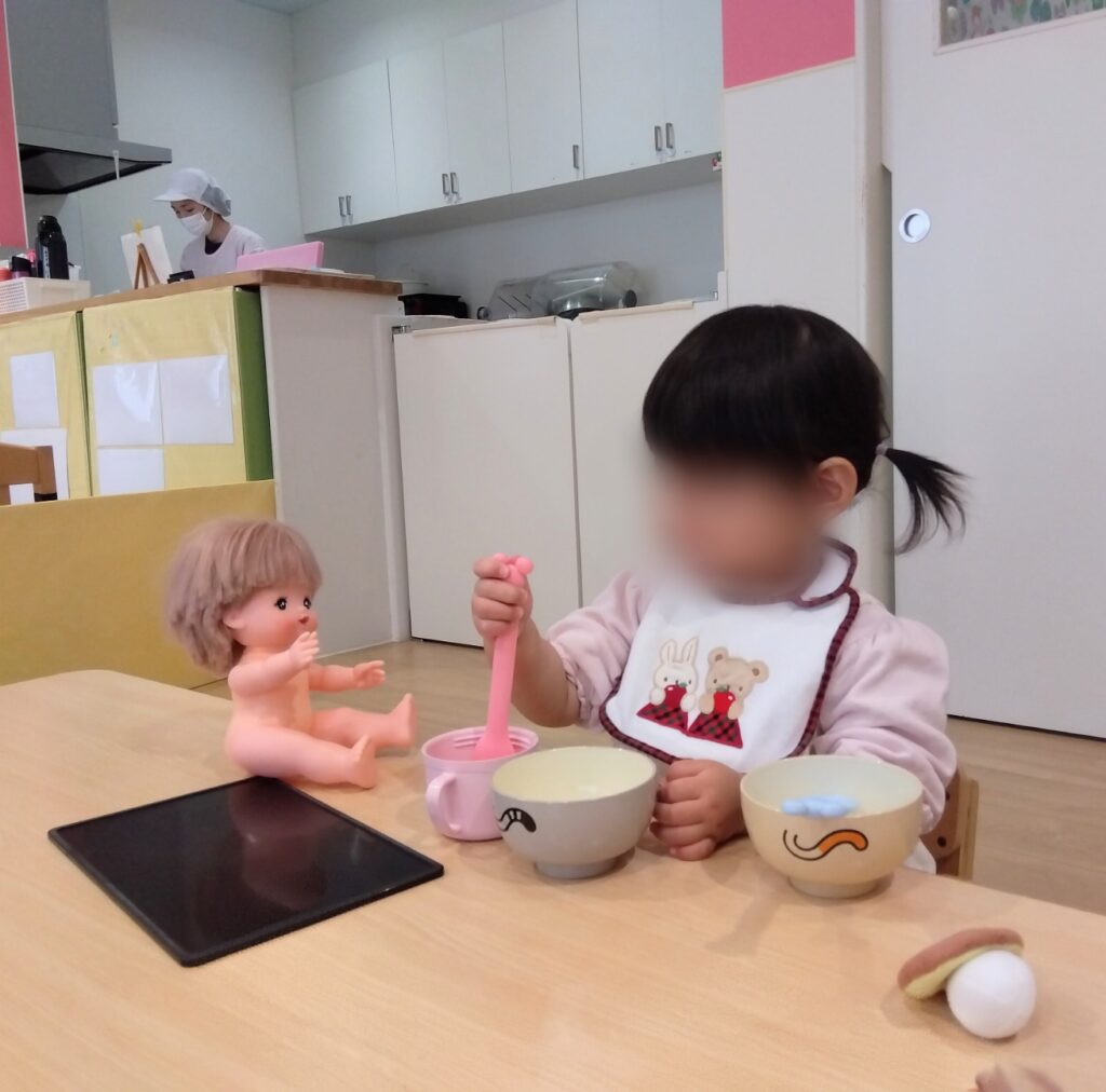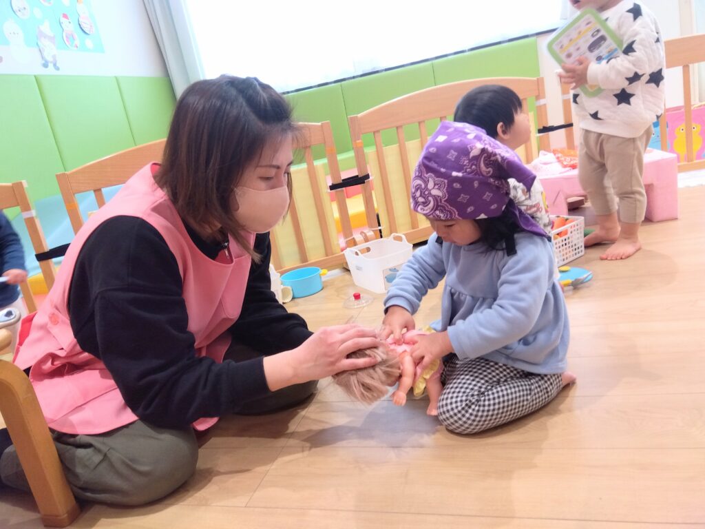 先生に手伝ってもらってお人形のお着替えをしたり、一緒に座ってご飯を食べたり
