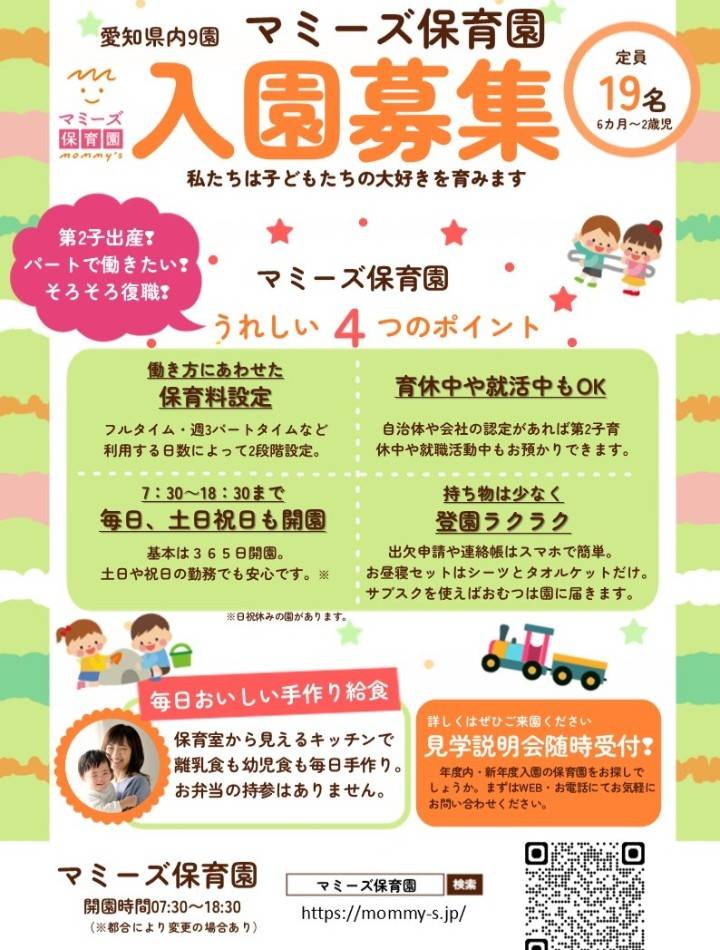 #マミーズ保育園 #名古屋市保育園 #名古屋市企業主導型保育園 #豊田市 #日進市 #半田市 #安城市 #尾張旭市 #名古屋市緑区 #名古屋市西区 #名古屋市中川区 #稲沢市 #入園募集 #園児募集 #0歳児 #1歳児 #2歳児