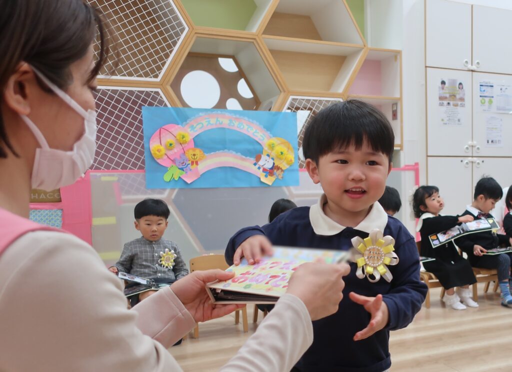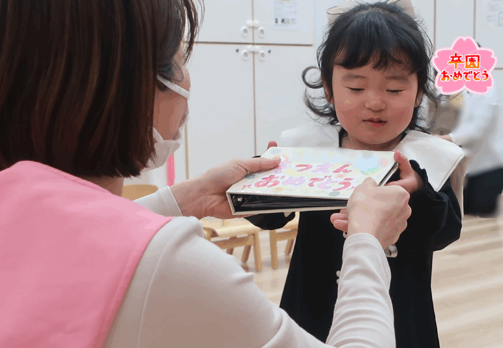 いつもと違う雰囲気に少し緊張している様子の子もいましたが、お父さん、お母さんと手をつないで入場する際は、にっこり嬉しそうな笑顔も見られました!卒園証書授与では、お名前を呼ぶと「はい!」と元気にお返事したり、卒園アルバムを「ありがとう!」と言って受け取る子どもたち。大きくなった姿に胸が熱くなりました。