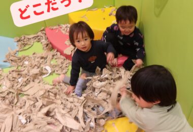 宅配の荷物に入ってくる緩衝材の紙をビリビリ破って葉っぱにしたら、かくれんぼ開始! 保育者が見守る中、みんなでお友達を隠したり、自分がもぐったりしながら遊びました。「どこかな~」と探していると「わー!」と飛び出してきたり、 […]