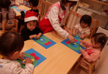 クリスマス会でリースの製作をしました。星やキラキラのシールを貼って飾りつけ。台紙からシールを自分ではがして貼る表情が真剣ですね🎖️指先がどんどん器用になってきて、保育者に手伝ってもらうことなく、1人で貼れるようになってき […]